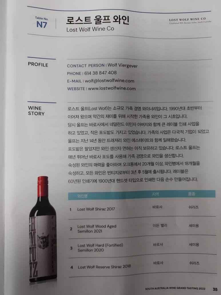 1988년, 서울에서 올림픽 하던 해에 Wolf Viergever의 부모님이 땅을 매입하셔서 관리하면서 92년도에 첫 포도를 수확했고 93년도에 첫 와인을 병입. 이 때는 Charlie Melton이라는 분이 와인을 양조했고, 와이너리가 국내에서도 아주 유명한 Torbreck 근처에 밭이 위치하고 있어서 2004,2005 그리고 2006은 와인 일부를 Torbreck에 팔기도 했다고...93년에 지금 wolf와 와이프인 Jacquie가 부모님으로부터 포도밭을 사서 지금의 Lost Wolf Wine이...본격적으로 와인 양조한 것은 딱 30년 된 중견 가족 와이너리!